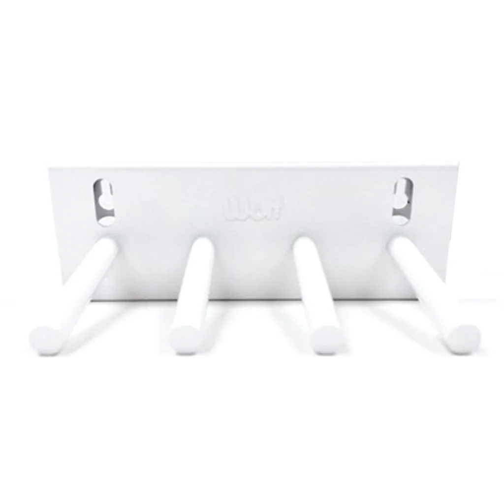 Wolf's Peg-Racks are made of steel and finished with a white baked-on polyester powder finish. 3” tall steel rack has 2 pegs per apron, the pegs project only 5" from the wall, and the racks are available in sizes to hold one, two, four, seven, or nine aprons.(2) #6 1¼" screws not included.