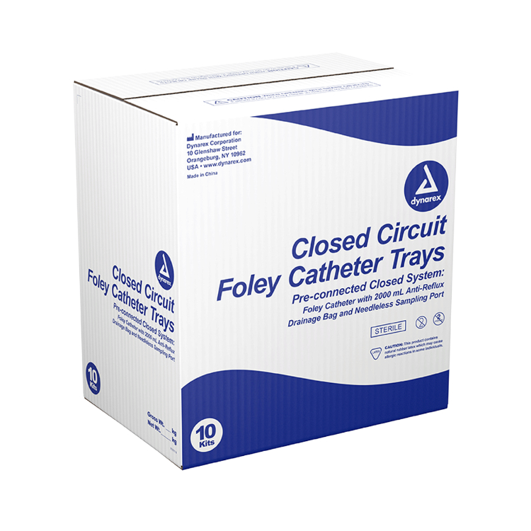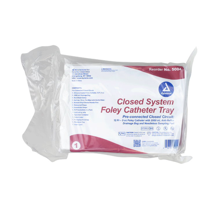 Closed System Foley Catheter Trays are ready-to-use closed catheter systems providing safe, simple catheterization designed to reduce the risk of urinary tract infections. Each is sterile and packaged in a tray ready to use.Includes: (1) Foley catheter - 12, 14, 16 or 18FR., 5cc; (1) 2000 mL Drainage bag; (1) Bed sheet clamp; (1) Syringe, 10cc, pre-filled with sterile water; (1) Waterproof drape; (1) Fenestrated drape; (2) Powder-free vinyl gloves, M; (3) PVP swabsticks in a pack; (1) Lubricating jelly; (1) Specimen container; (1) Patient label; (1) Packaging overwrap; (1) Procedure tray; (1) Insert tray