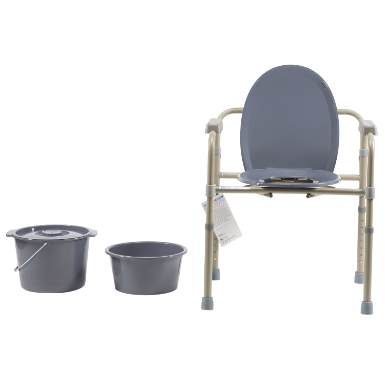 The Dynarex Elongated Folding Bedside Commode is a versatile, three-in-one commode that can be configured as a commode, raised toilet seat or toilet safety rail over your current toilet. The tool-free design allows for easy set up with height adjustments in 1-inch increments to raise or lower the chair height and safely accommodate any individual. This durable, steel welded construction includes a plastic snap on elongated seat with lid, 10-quart drop-in bucket with handle, splash guard, plastic armrests for added comfort and removable tool-free back.