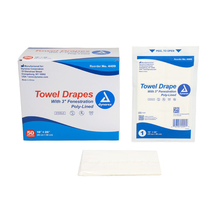 Dynarex Disposable Towel Drapes provide a sterile drape for use in minor surgical or therapeutic procedures. The drapes are 3 ply with a poly-interlined lining that provides absorbency, while preventing possible moisture or bacteria migration. The Towel Drapes are available in both plain and fenestrated options.