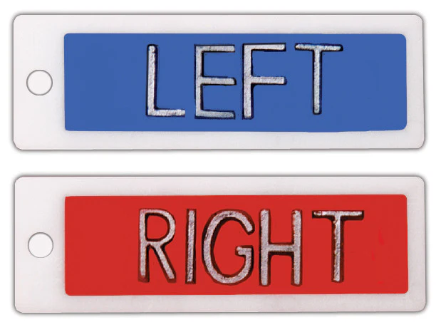 Identifier style markers feature high-density lead letters embedded in an injection molded, high-impact white polystyrene casing. Coded red for "right," blue for "left" they are available with or without initials or numbers.