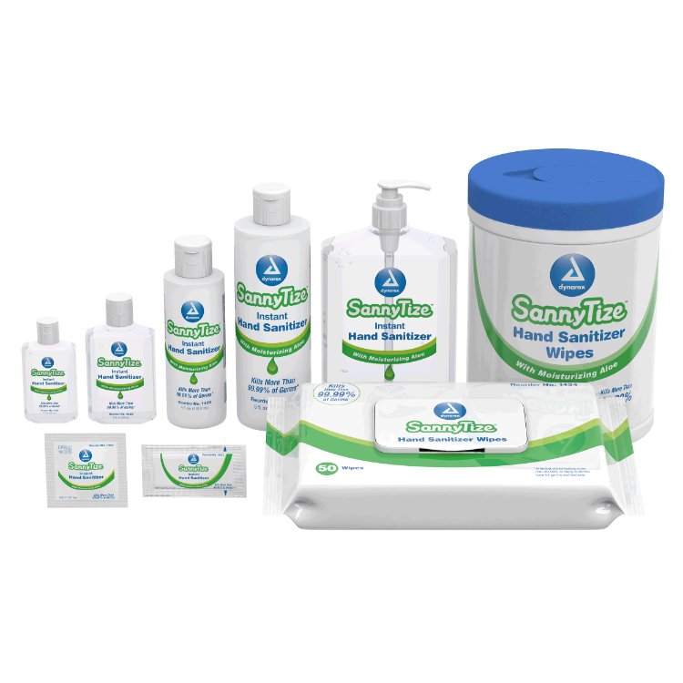 • Available in 1 oz. bottles (1427), 2 oz. bottles (1428), 4 oz. bottles (1429), 8 oz. bottles (1431), 16 oz. pump bottles (1432), 0.9 g. packets (1433), soft pack 5.9" x 7.5" sanitizer wipes (1434), 5.9" x 7.5" sanitizer wipes (1306), and 5" x 8" individually wrapped sanitizer wipes (1307)