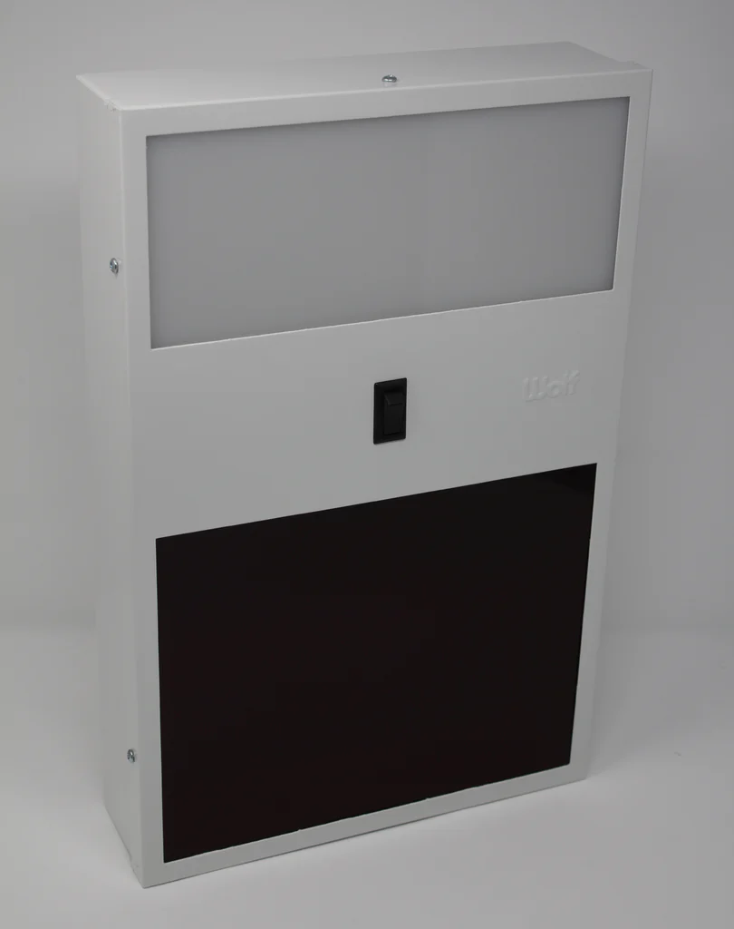 This unique two-compartment unit features a safelight at the bottom and a normal incandescent room light at the top. The safelight is filtered by our 8" X 10" GBX Type filter and comes with a 6' cord and a 3 prong plug.