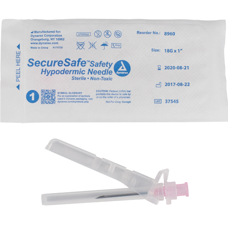 The Dynarex SecureSafe Safety Hypodermic Needles provide a sterile, effective way to deliver comfortable injections. All needles are color coded to represent the gauge of the needle are compatible with both luer lock and luer slip syringes. The thin wall needles have a double bevel, allowing for ease of penetration while helping larger doses flow smoothly. The SecureSafe safety mechanism features a quick cover that enables the user to cover and protect the needle with a press and snap.