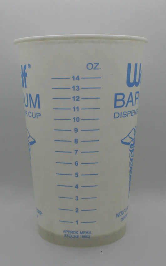 Wolf's Barium Paper Cups are 14-ounce paper cups that feature printed mixing scales of 0 to 14 ounces and 0 to 400 cc's. Cups are packed 50/sleeve and are available in quantities of 100, 1,000, 5,000 and 10,000.