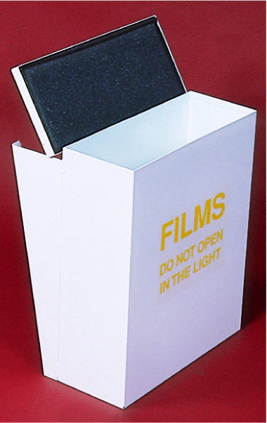 Light-proof film storage bins in a table top format, these bins can also be mounted on the side of a desk via 2 keyholes. Wolf manufactures 2 sizes: the "standard" accommodates up to 150 14" x 17" films; the "mammo" accommodates up to 150 mammography films. Both feature a closure device that automatically closes the door after films are removed.
