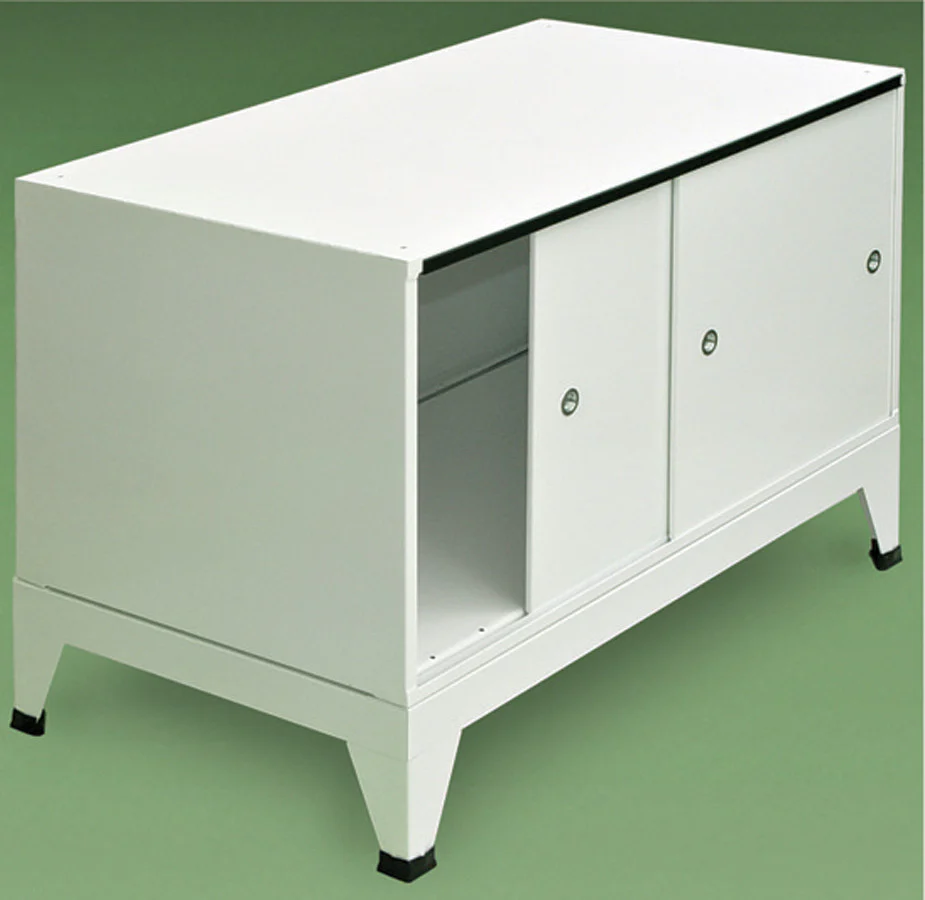 Individual units are secured to each other by bolts and come with 3 adjustable dividers. Paneled doors slide easily at the touch of a finger for ready access. Overall finish is in attractive, easy to clean white baked on enamel.
